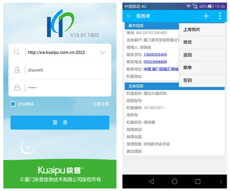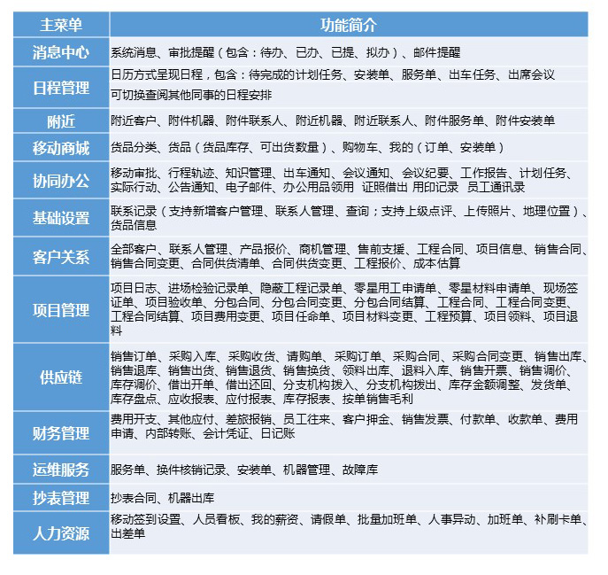移動服務(wù)接單、機(jī)器二維碼掃描、手機(jī)拍照定位、機(jī)器新增查詢、耗材查詢、客戶新增查詢、實(shí)時庫存查詢、知識庫查詢、應(yīng)收款及對帳、移動辦公及審批等;