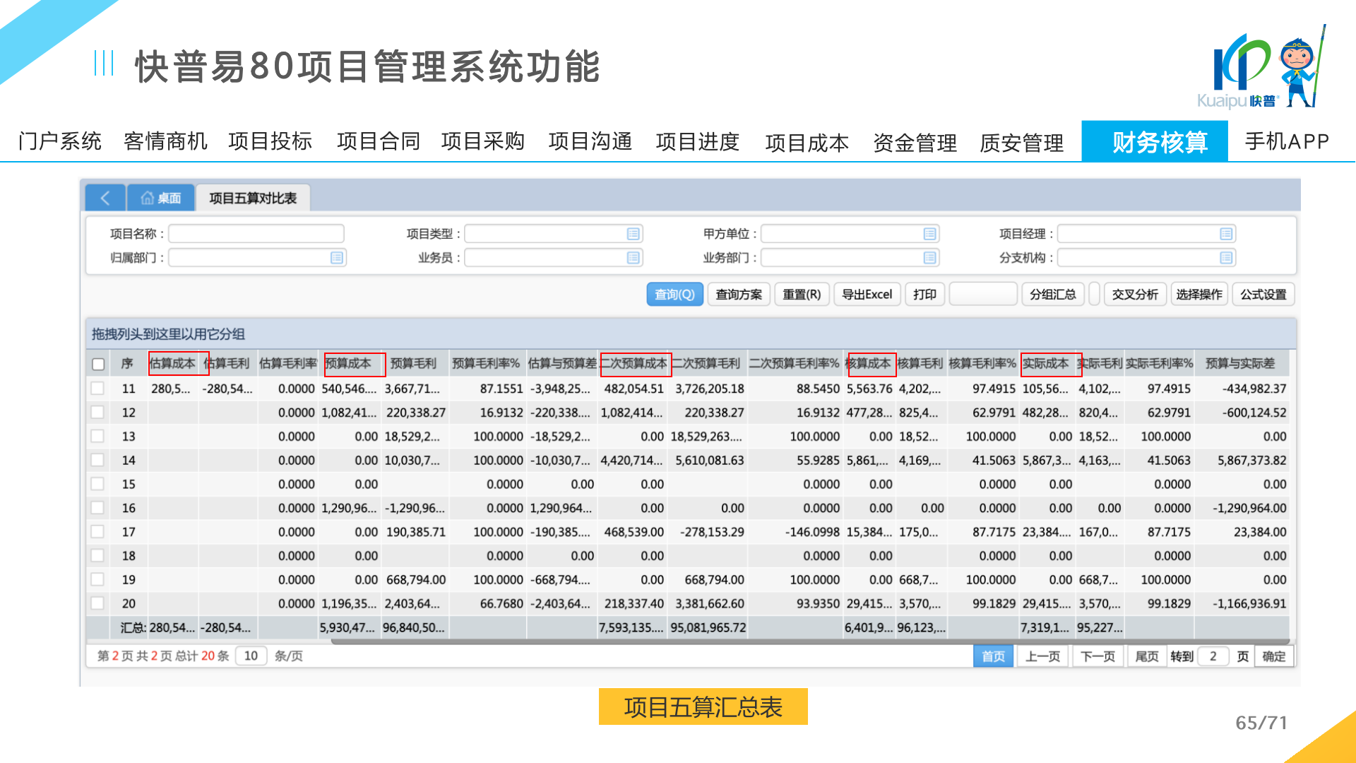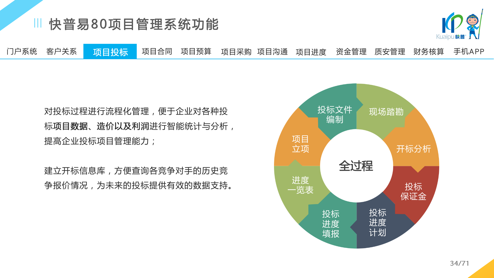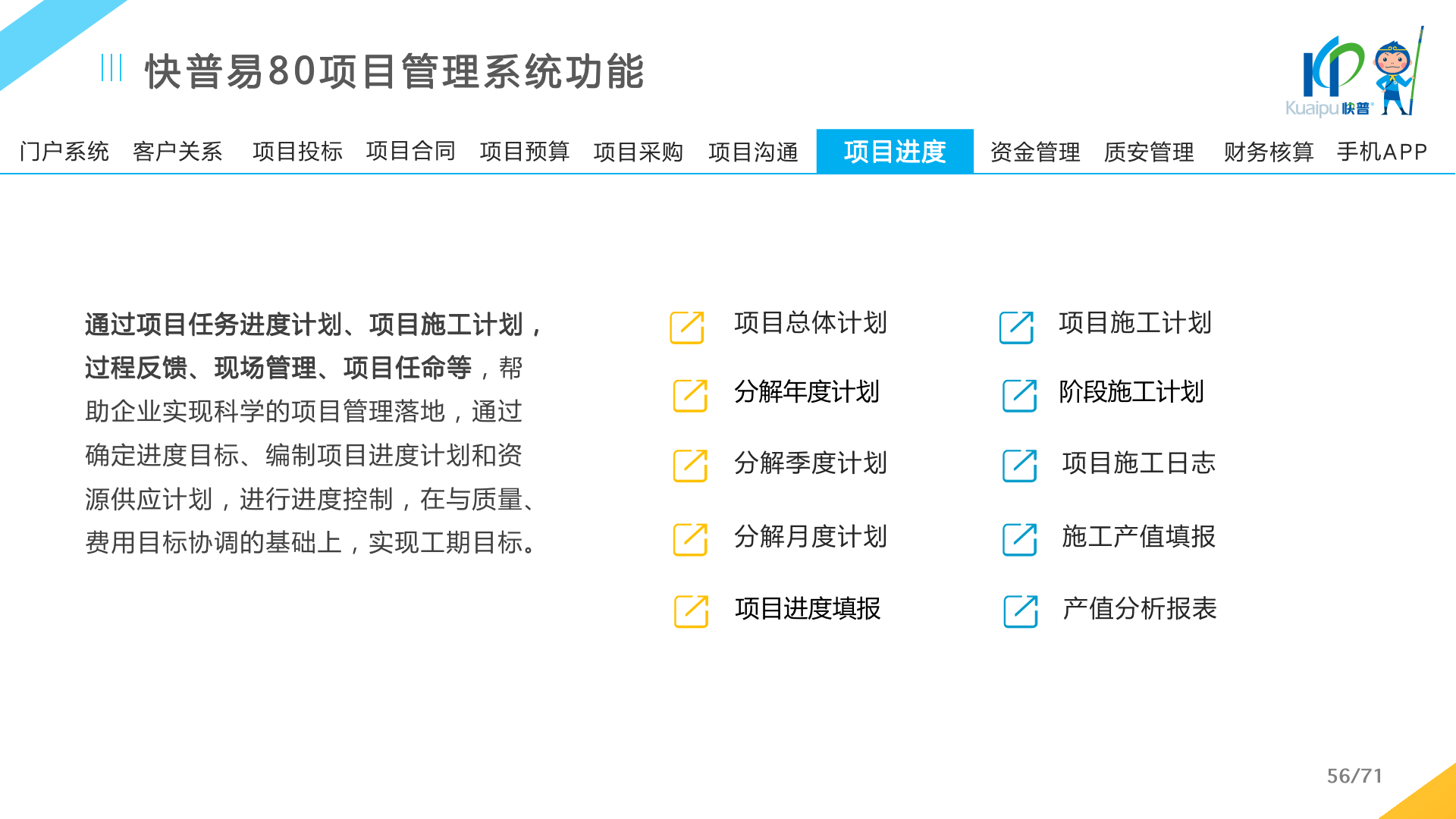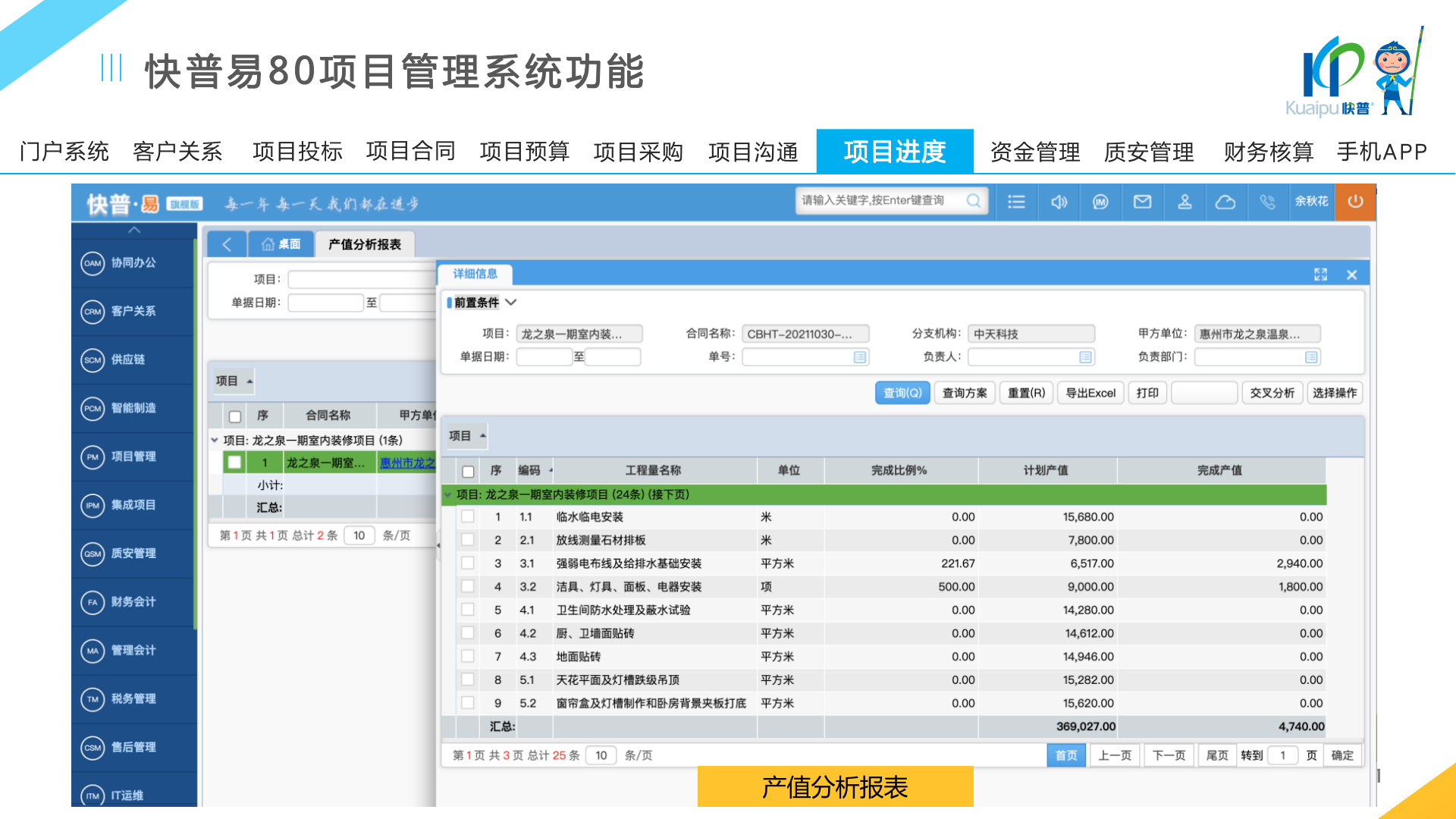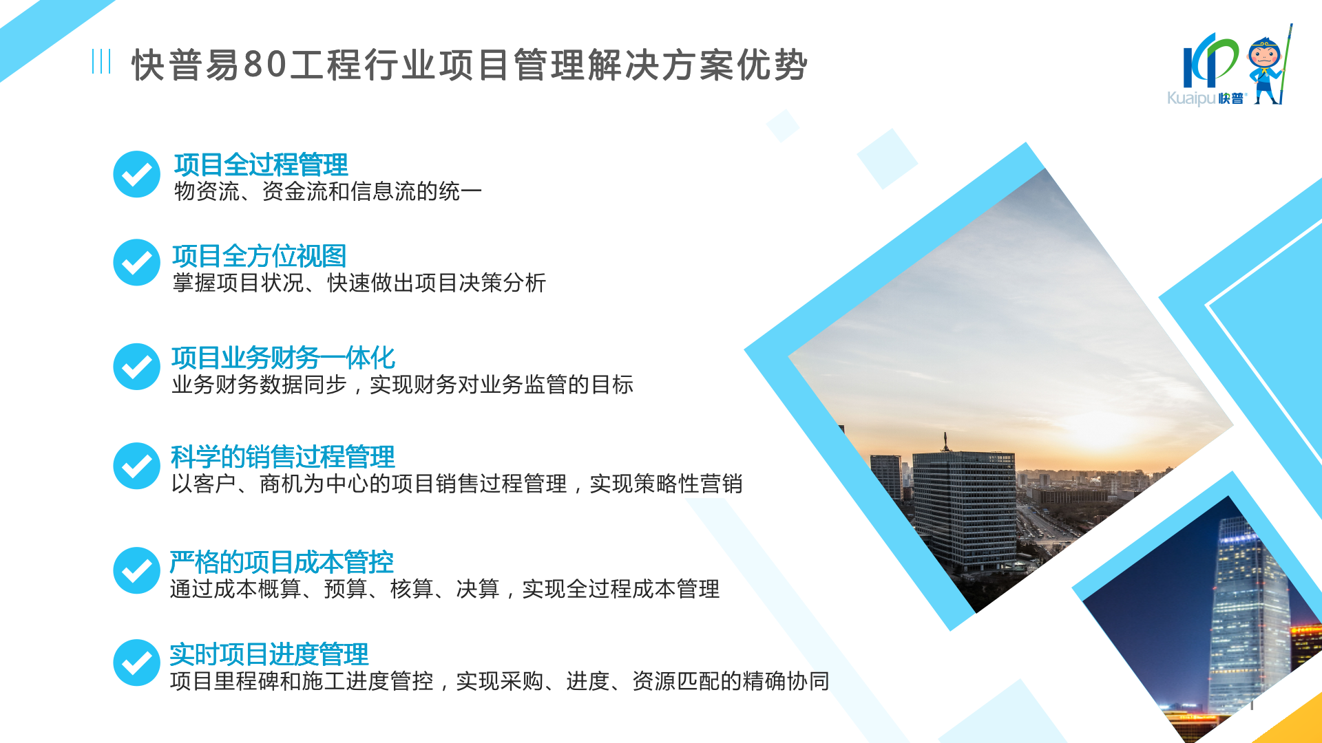 快普易80以項(xiàng)目管理為核心,通過“四控、四管、一協(xié)調(diào)”方式,對(duì)項(xiàng)目進(jìn)度、成本、資金、質(zhì)量安全進(jìn)行全面控制,實(shí)現(xiàn)投標(biāo)管理、合同管理、物資管理、預(yù)算管理等項(xiàng)目全生命周期項(xiàng)目的數(shù)字化管理,實(shí)現(xiàn)資源合理配置、保障良好的項(xiàng)目效益。