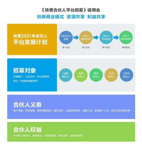 快普合伙人平臺將依托快普整合管理、專注細(xì)分行業(yè)與強(qiáng)大的技術(shù)平臺支持三大優(yōu)勢,面向各行各業(yè)招募合伙人,通過多種合作形式,建立“快普落地服務(wù)商”,幫助全國更多企業(yè)實現(xiàn)信息化轉(zhuǎn)型,提高企業(yè)的技術(shù)創(chuàng)新能力與品牌價值。