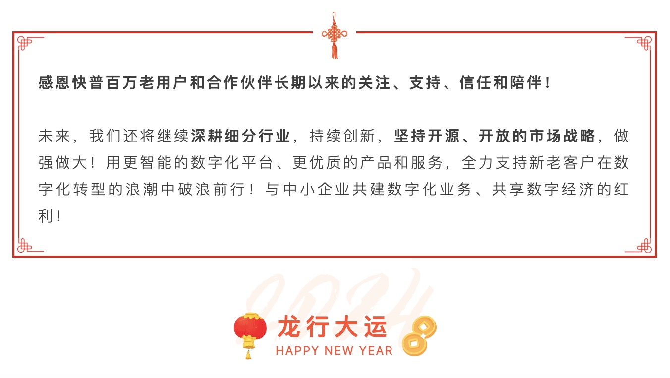 2023年是快普銳意改革、開拓進取的一年。面對機遇和挑戰(zhàn),我們苦練內(nèi)功,加大研發(fā)投入,積極擁抱市場,通過新一代“易”系列產(chǎn)品,幫助大量企業(yè)成功實現(xiàn)數(shù)字化的轉型升級,賦能企業(yè)邁向高質(zhì)量發(fā)展!同時,快普也實現(xiàn)了自身的逆勢增長,多項科技創(chuàng)新成果獲得了政府的嘉獎與社會各界的好評!2024年,我們不忘初心,堅守“數(shù)字化平臺服務商”的使命,1月份再創(chuàng)多項佳績!