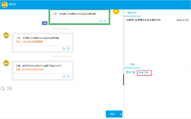 方法一、 通過(guò)會(huì)話窗口右邊“查詢(xún)工單”即可查看所有提交過(guò)的問(wèn)題