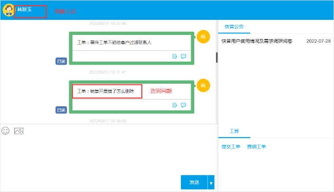 第二步:工單被客服認(rèn)領(lǐng)后,您可看到左上角有具體的受理工程師,咨詢(xún)自動(dòng)形成一個(gè)問(wèn)題管理。