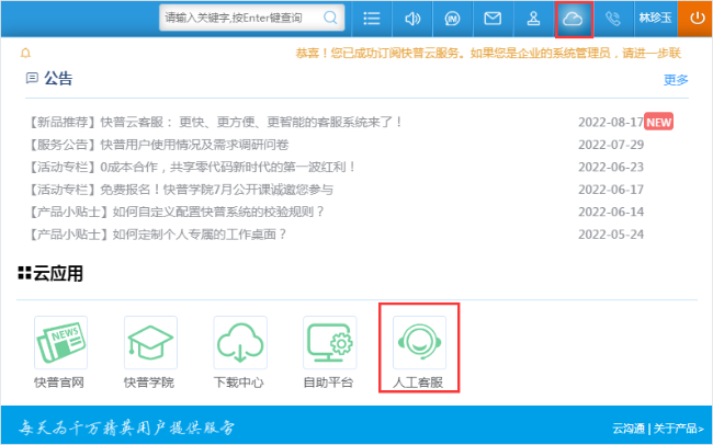 第一步: 用戶(hù)(管理員權(quán)限才可以哦)通過(guò)快普系統(tǒng)→云服務(wù)→人工客服,即可發(fā)起咨詢(xún)