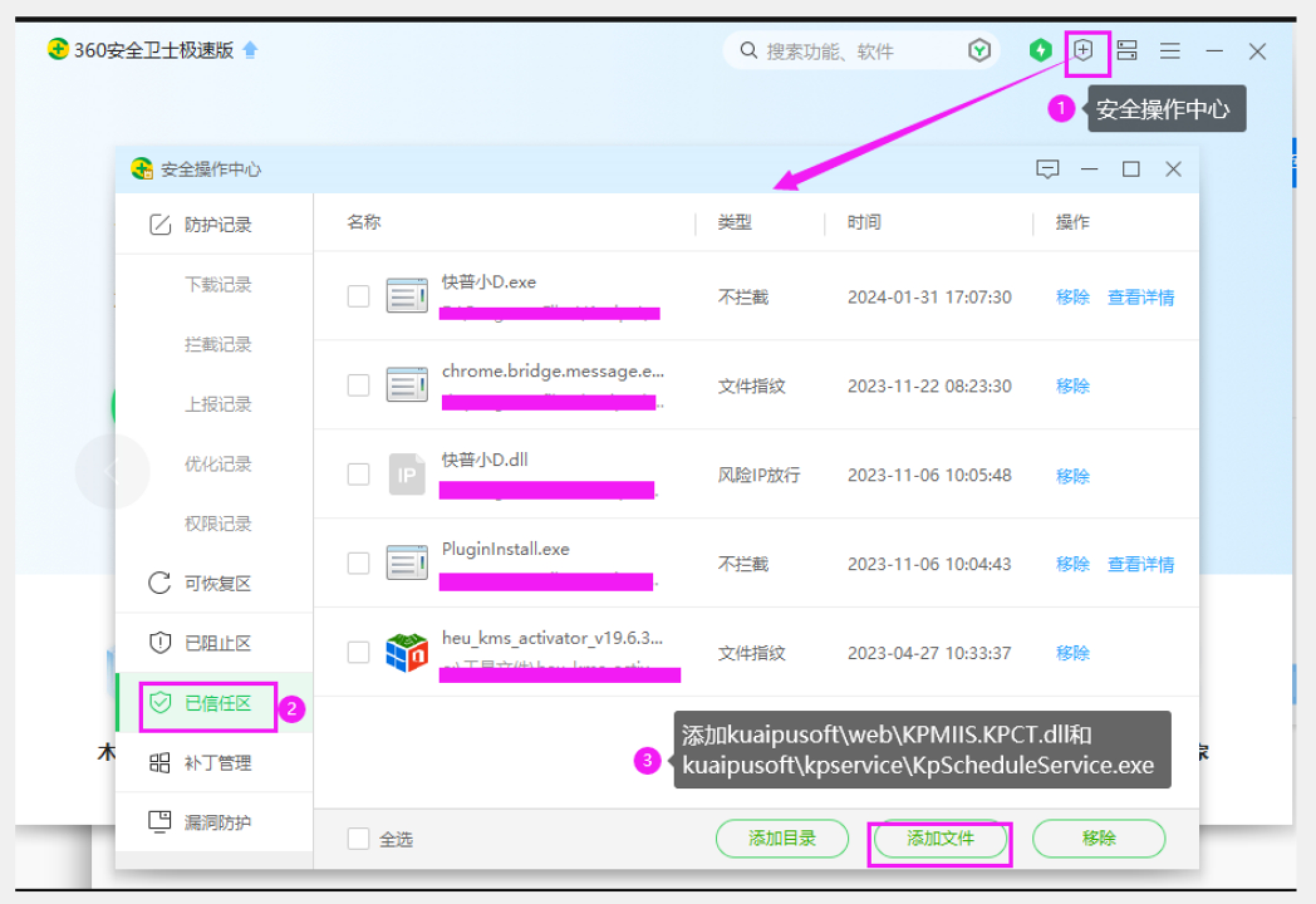 沒加入信任就被360隔離的,上面截圖那幾個文件可在隔離區(qū)恢復,恢復后按上面方法加入信任: