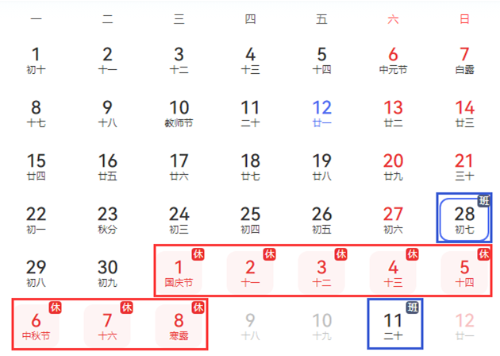 放假調(diào)休安排如圖所示: “藍(lán)色框”為補(bǔ)班時(shí)間、“紅色框”為放假時(shí)間