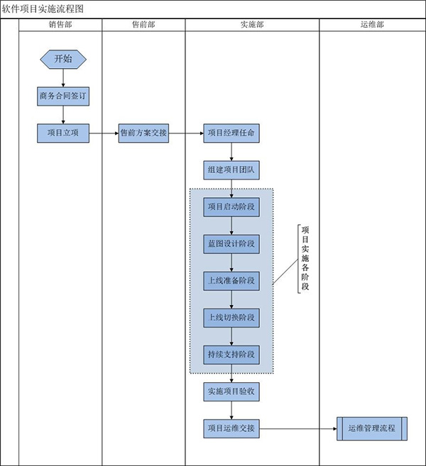 快普軟件項(xiàng)目實(shí)施分為五個(gè)階段:項(xiàng)目啟動(dòng)階段、藍(lán)圖設(shè)計(jì)階段、上線準(zhǔn)備階段、上線切換階段、持續(xù)支持階段。每個(gè)階段都有對(duì)應(yīng)的階段交付成果。完成這五個(gè)階段的任務(wù)之后,進(jìn)入實(shí)施項(xiàng)目驗(yàn)收階段。實(shí)施驗(yàn)收完成之后,轉(zhuǎn)入運(yùn)維部門,實(shí)施過程結(jié)束。